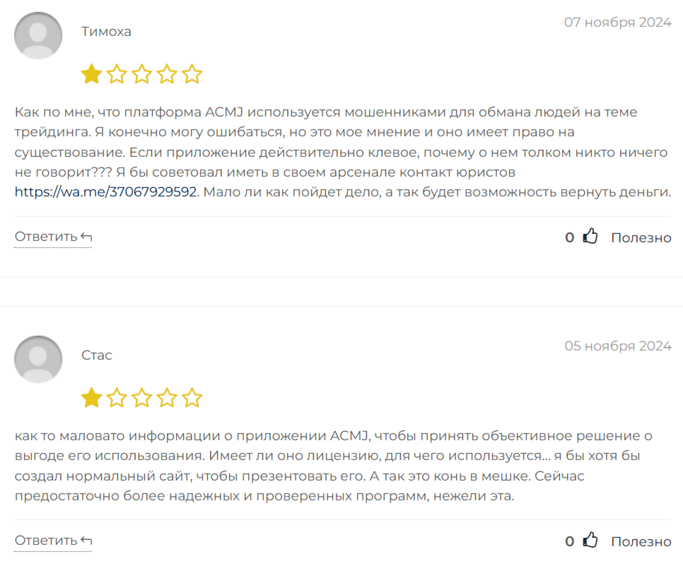 В отзывах о ACMJ встречаются и минусы. Многие клиенты отмечают, что приложение является мошенничеством. При этом никаких разъяснений по поводу таких жалоб не дается. Не исключено, что такие комментарии являются заказными со стороны конкурентов.