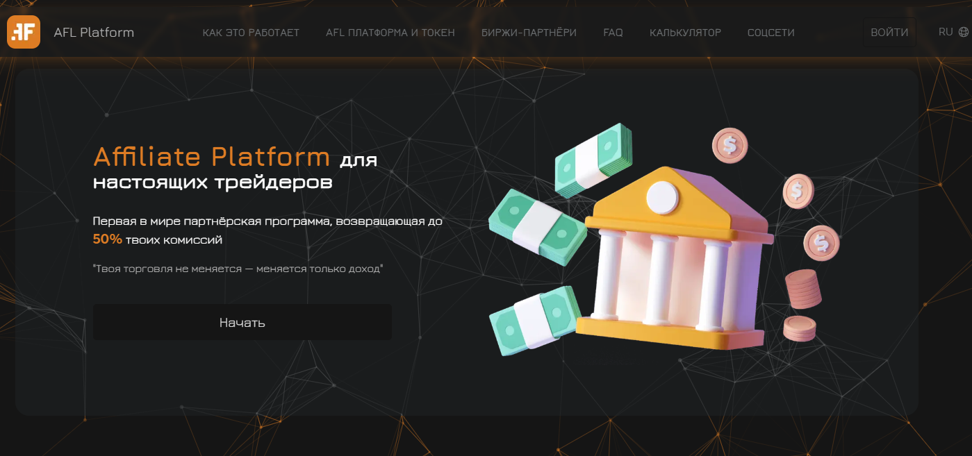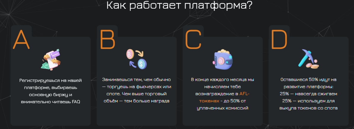 Если говорить просто, это партнерская программа. Трейдеры торгуют на биржах, как и раньше. А платформа возвращает им часть комиссий. Кэшбэк начисляется не в долларах. Его выдают в токенах AFL. Это собственная монета проекта.