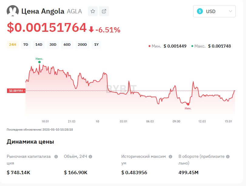 На 10 мая 2025 года курс токена Agla составляет $0,00151764, а суточный торговый объем достиг $166,9 тыс. За последние 24 часа стоимость монеты снизилась на 6,51%. В обращении находится примерно 499,45 млн токенов. Максимальный объем эмиссии установлен на уровне 3 млрд Agla.