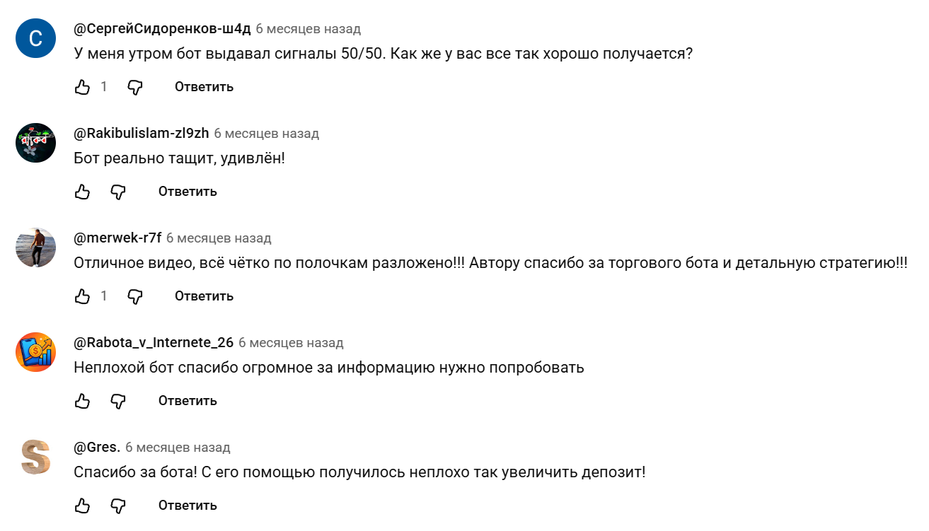 В интернете можно найти множество отзывов о Ai ProInvest Bot. В них пользователи, как правило, отмечают невысокую точность сигналов. Некоторые трейдеры говорят, что отношение правильных и ошибочных сигналов составляет где-то 50 на 50.
