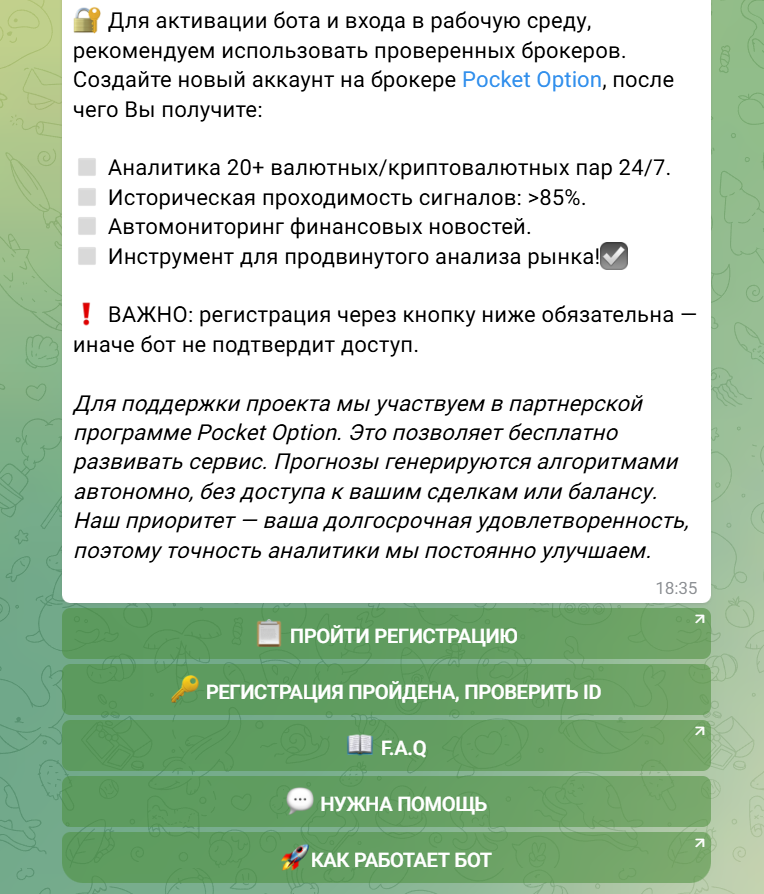 Для применения возможностей бота клиентам необходимо зарегистрироваться на бирже Pocket Option. Переход всегда осуществляется по реферальной ссылке. После создания учетной записи от пользователей требуется проверка ID.