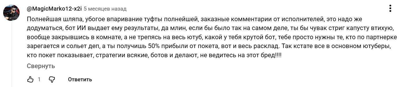Некоторые пользователи сразу предупреждают о рисках. Они отмечают, что такой помощник ведет к сливу депозита. Ни о какой эффективности ботов, работающих на базе искусственного интеллекта, и речь не идет.