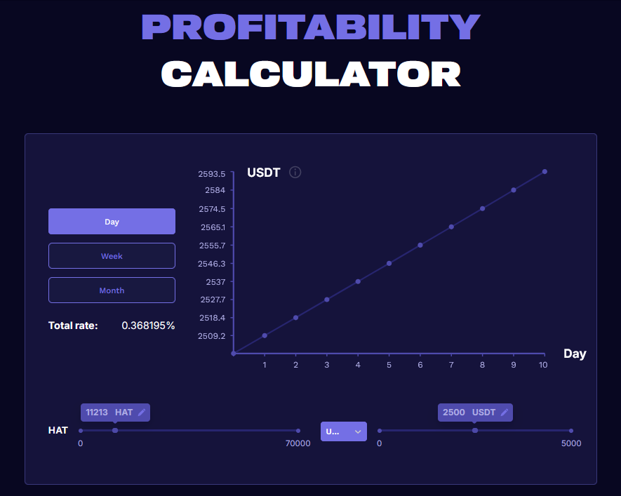- В день вложение средств приносит до 0,2% от общей стоимости инвестиции. Для повышения суммы дохода можно увеличивать количество монет HAT.