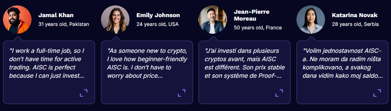 На сайте aisc online публикуются отзывы клиентов. Все они говорят о возможностях получения высокого дохода от вложений в платформу. Но на сторонних ресурсах найти упоминания о монете не удалось. На профильных форумах нет веток компании. В среде трейдеров не ведутся обсуждения о доходности и надежности ИИ-монеты.
