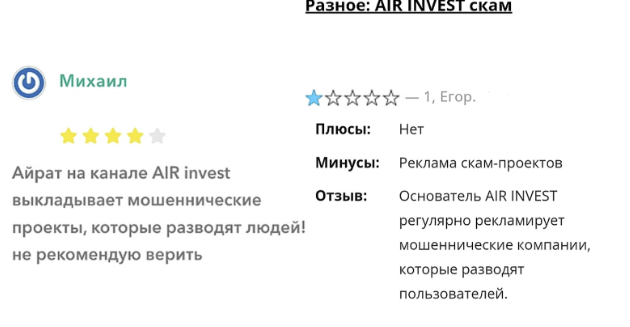 В интернете отзывы об “Аир инвест” представлены считанными единицами. И все они отрицательные, положительных не имеется. Клиенты “профессионального” трейдера оставляют негативные комментарии о наличии лохотрона и развода, скама рекламируемых проектов. На сторонних интернет-ресурсах довольных подписчиков не нашлось.
