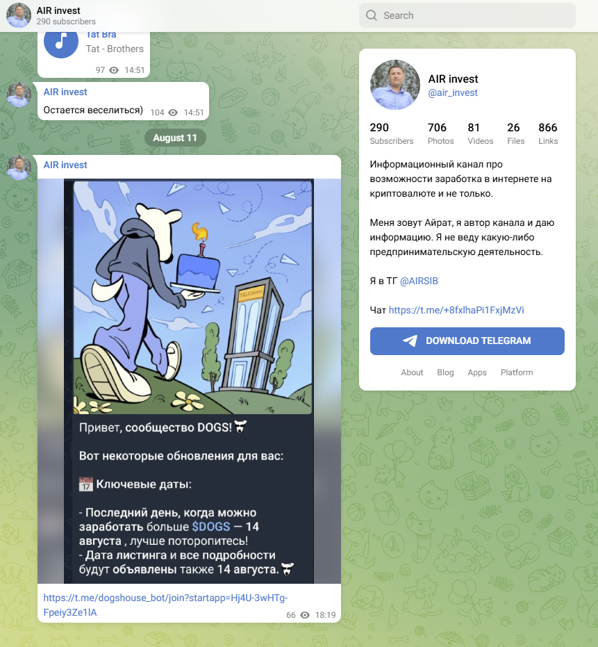 Air invest является проектом в Telegram трейдера Айрата Сибгатова. Он позиционирует себя, как успешного специалиста по заработку на криптовалютном рынке. В интернете имеются сведения о возможном его мошенничестве, в обзоре проверим эту информацию на достоверность.
