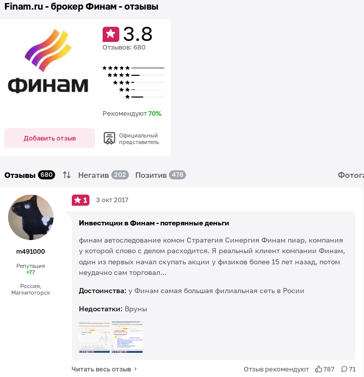 Мы выяснили, что основная компания «Финам» работает более 25 лет, но когда конкретно был запущен курс – неизвестно. За большой период времени фирма не смогла заработать успешную репутацию и большую популярность. На независимых источниках ее рейтинг составил 3,8/5 что довольно мало. Здесь оставлено 478 положительных и 202 отрицательных отзыва.