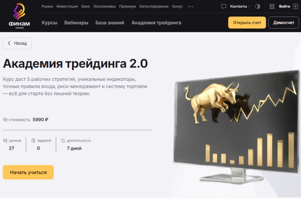 Курс «Академии Трейдинга Финам» имеет приписку «2.0», что должно говорить о том, что: либо это второй поток, либо обновленное продолжение первой части. Но о таком курсе в сети нет ни слова. На сайте организации он тоже не упоминается, что намекает на то, что это самостоятельный первый курс.
