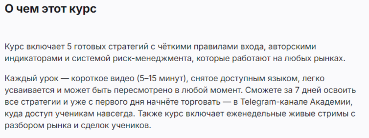 В описании продукта рассказывается, что он включает 5 рабочих стратегий, уникальные индикаторы, точные правила входа, риск-менеджмент и систему торговли. Все эти материалы помогут новичкам начать зарабатывать на трейдинге без лишней теории.