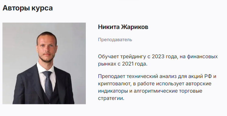 На странице с продуктом рассказывается его программа и небольшие подробности. Подробнее об этом мы расскажем позже. Здесь же знакомят с автором курса. Его зовут Никита Жариков. На финансовых рынках он работает с 2021 года, преподает трейдинг – с 2023 года.