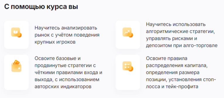- научиться использовать алгоритмические стратегии, управлять рисками и депозитом при алго-торговле;