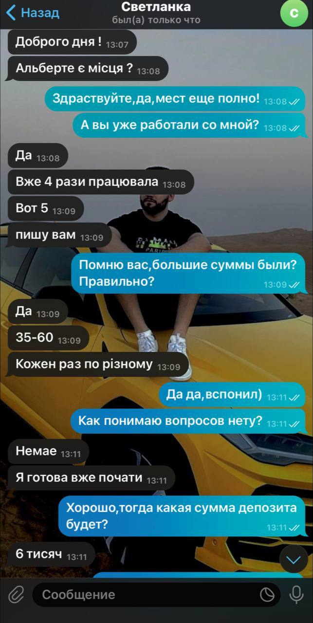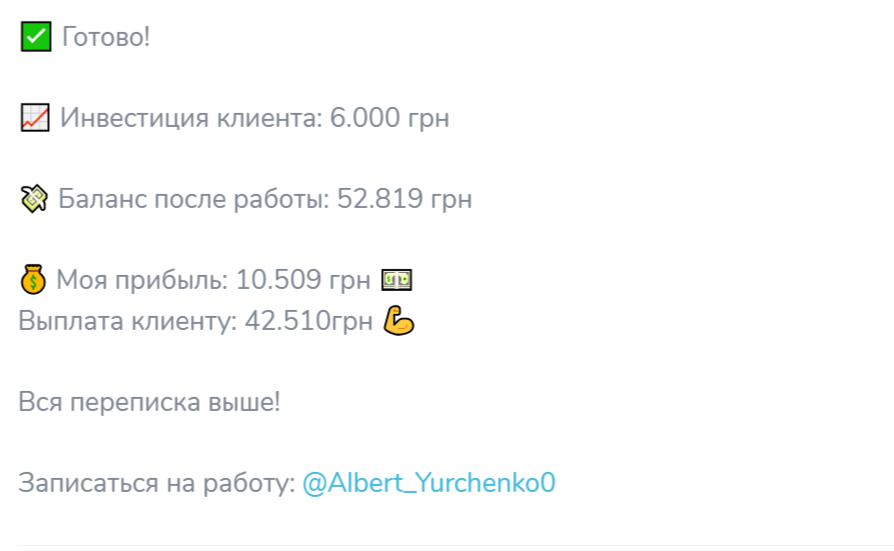Для предоставления услуг герой материала создал канал Альберт|Official🇺🇦. Сообщество работает несколько месяцев и наполняется бесполезным контентом. Автор предлагает клиентам вложить определенную сумму в гривнах. После этого он прокручивает ее на рынке и возвращает в 9-10 раз больше. Часть полученной прибыли он забирает себе. Чаще всего речь идет где-то о 20% от дохода.