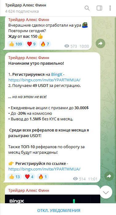 Зарабатывает Алекс на рефералах. В ленте он публикует ссылку на биржу BingX, предлагает регистрироваться на ней, рассказывает о бонусах и выгодных условиях. Его главная цель – завлечь подписчиков на эту биржу и получить за это вознаграждение. А еще она платит ему процент от слитых депозитов рефералов. Исходя из этого, доверять его советам мы не рекомендуем.