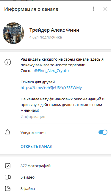 Канал «Трейдер Алекс Финн» был создан летом 2024 года. Его админ утверждает, что он успешный крипто трейдер, хорошо разбирается в тонкостях торговли цифровыми активами и обещает научить зарабатывать на криптовалюте других. О себе этот эксперт ничего не рассказывает. Называет себя он Alex. Но неизвестно, настоящее ли это имя, как и фото в ТГ. Также он не демонстрирует доказательства своей экспертности, верифицированной статистики его сделок нет.