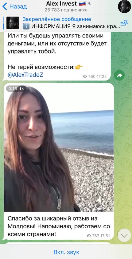 На канал @InvestAleksandr были подписаны 25 000 человек, из которых около 700 просматривали посты: аудиторию накрутили ботами. Владелец канала Alex Invest публиковал много фотографий, которые можно увидеть на других аналогичных каналах. Работал под именем Саша Соболев (@AlexTradeZ). В июле 2024 года канал уже закрыт, а его создатель пропал.