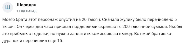 Не ведитесь на этот развод на деньги! Этот жулик обещает быстрый доход без рисков, а в итоге он и есть главный риск! Доверил ему 10000 рублей, через пару часов он прислал фейковый скриншот что моя прибыль увеличилась в 10 раз!!! До чтобы забрать ее нужно заплатить комиссию 15%!!! Я заплатил, так как думал, что все равно буду в наваре, в этот гад меня кинул в блок!