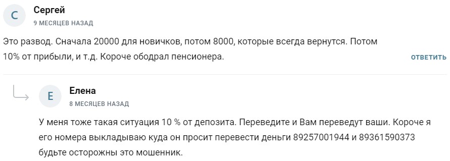 Несмотря на примитивную схему развода, трейдер умудрился развести большое количество клиентов. Они подтверждают, что у них сначала отбирали депозиты, а затем пытались развести на следующие платежи.
