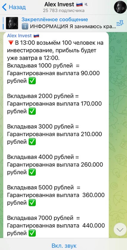 Алекс Инвест был мошенническим каналом, как и все остальные сообщества с предложением раскрутки. Это видно по той запредельной прибыли, которую обещал его автор — никакой трейдер не способен увеличивать капитал в 90 раз за день. Обещать такое — типичный почерк мошенников, которые охотятся на доверчивых людей.