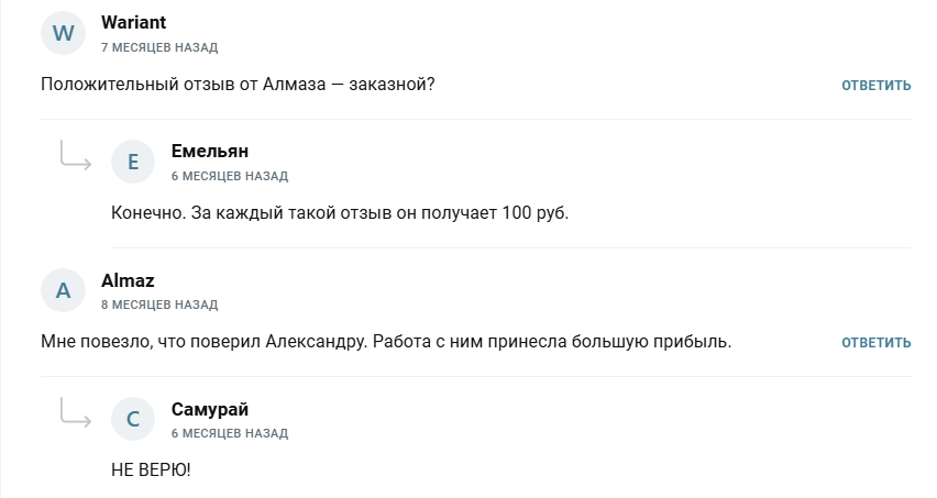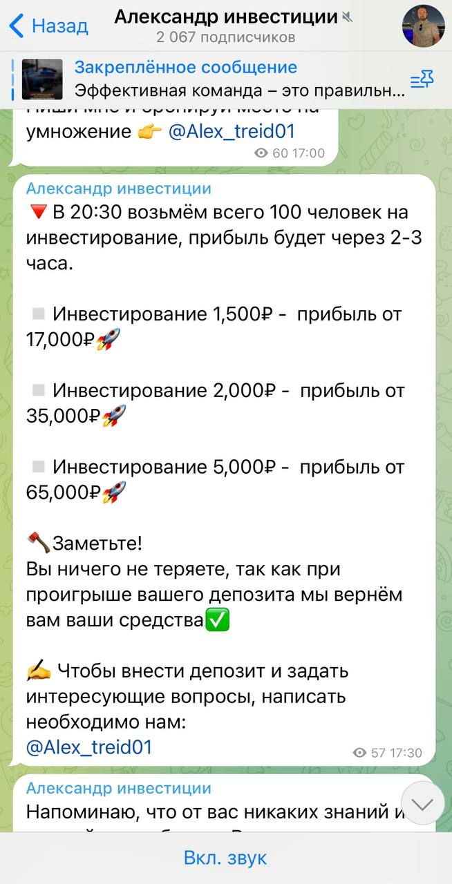 Эта схема мошенничества активно применяется злоумышленниками. И, несмотря на это, находятся люди, которые продолжают им доверять. В интернете множество негативных отзывов о @Alex_treid01 от пострадавших инвесторов.