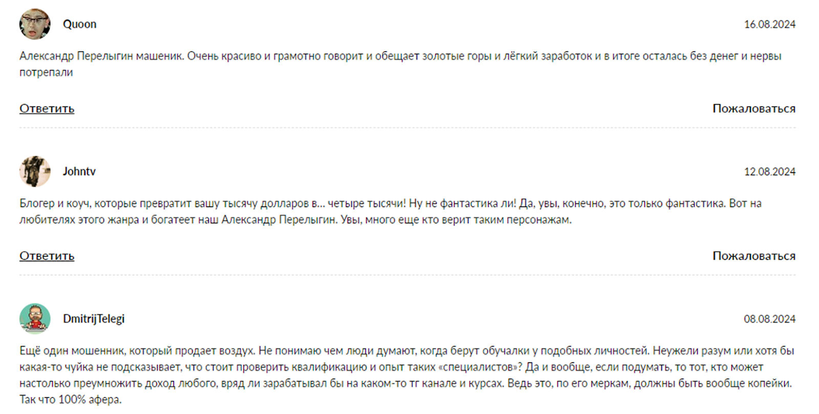 На проекты из области крипто Александра Перелыгина отзывы не самые хорошие. Пользователи утверждают, что мужчина очередной инфоцыган, который не заслуживает доверия.