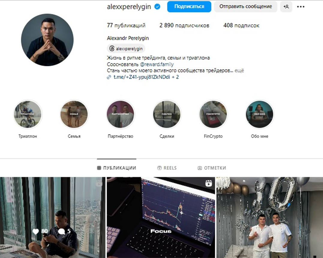 Специалист по торговле криптовалютой Александр Перелыгин о себе практически ничего не рассказывает. Хотя у него есть публичные аккаунты в телеграмм и инстаграмм.