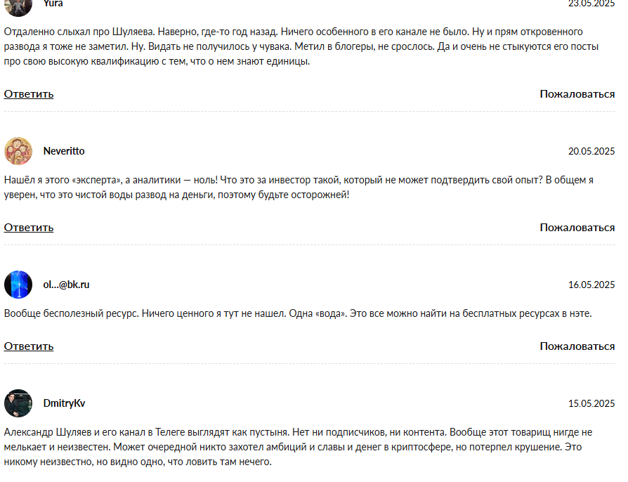 - последние публикации на канале Шуляева PRO Инвестиции и финансы датируются мартом 2024 года, другие социальные сети так же заброшены;