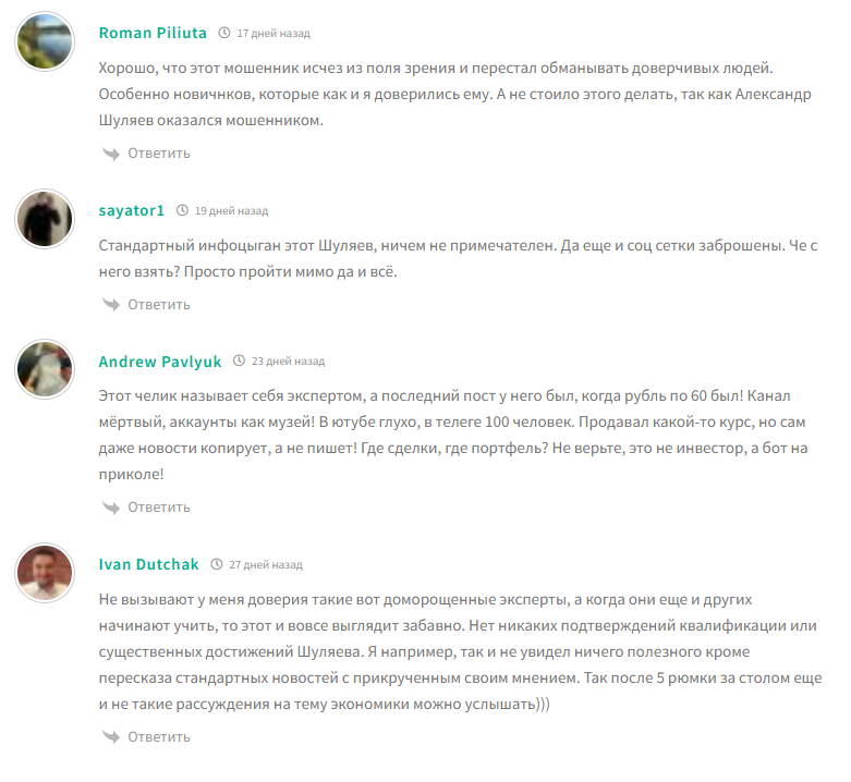 Теперь разберем, что пишут об авторе люди в интернете. Сначала стоит отметить, что во всех социальных медиа Шуляева открыты комментарии. Но активности в них практически нет. Изредка появляются сообщения, не связанные с мнением о трейдере в целом.