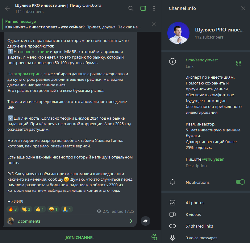 Главный канал проекта носит название «Шуляев PRO Инвестиции Пишу фин бота» и доступен по ТГ-юзернейму sandyinvest. Сейчас на него подписаны около 100-120 пользователей. Но их число существенно сократилось со временем, поскольку последний пост здесь выходил еще в марте 2024 года.