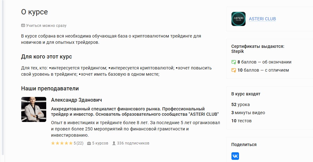 Всего в программу Здановича входит 65 занятий и всего около 6 часов видео, и отдельно продуманно 50 тестовых заданий. Ученикам также обещают домашние задания и обратную связь на вебинарах с авторами и кураторами. Бонусом идет доступ к ресурсам комьюнити ASTERI CLUB и готовым крипто сигналам.
