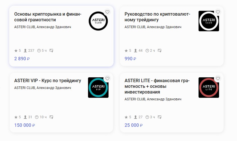 На момент написания обзора (май 2025 года) стоимость курса Asteri VIP составляет внушительные 150 000 рублей. Помимо этого, Александр Зданович продает и урезанные версии: