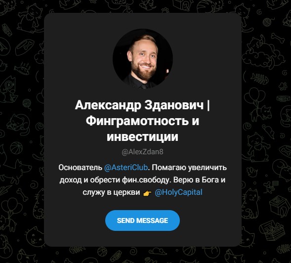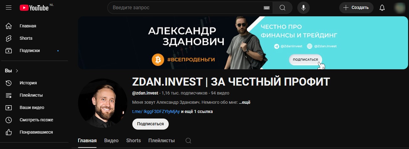 Связаться с «гуру» и записаться на обучение можно исключительно через Telegram, а это, мягко говоря, странно для серьезного образовательного проекта. Обычно такие компании имеют добротный веб-сайт со всей необходимой информацией. Зато Александр ведет Ютуб-канал «ZDAN INVEST ЗА ЧЕСТНЫЙ ПРОФИТ» и страничку в ВК @zdaninvest.