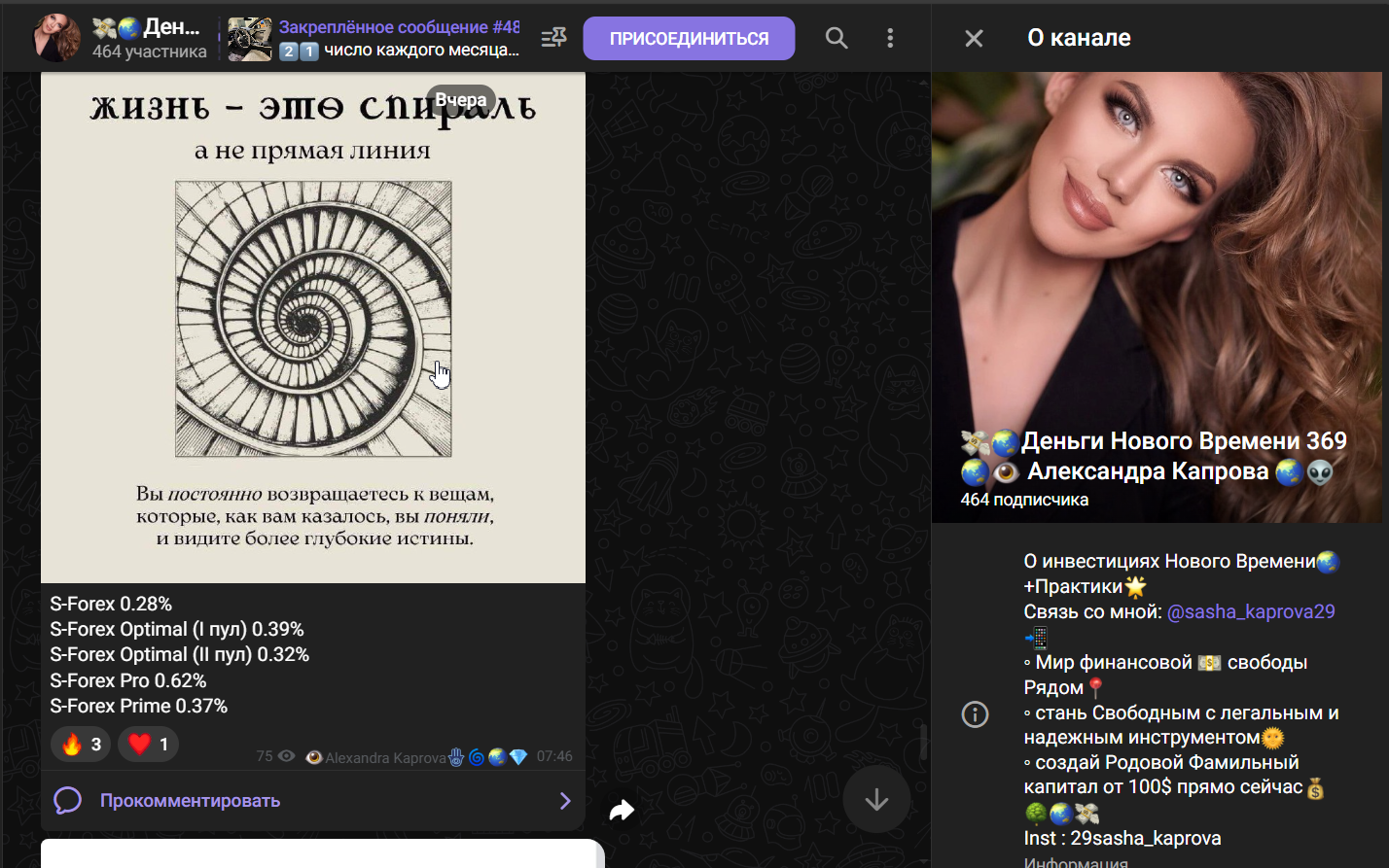 Александра Карпова курирует авторский инвестиционный проект, который, по заверению админа, поможет любому желающему обзавестись надежной и стабильной финансовой подушкой. Полное название канала – “Деньги Нового Времени 369 Александра Капрова”. В открытых источниках его не обсуждают. Это и заставило нас проверить проект на скам и обман. По всем первичным признакам он похож на инфоцыганский.