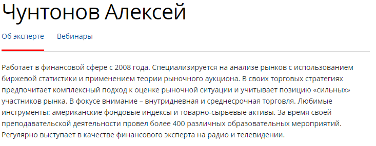 Алексей Чунтонов утверждает, что 12 лет работал в брокерских агентствах. Позиции и регалии не раскрывает. В сфере трейдинга и инвестиций с 2008 года. Эксперт платформы Финам, преподавал несколько курсов по внутридневной и среднесрочной торговле.