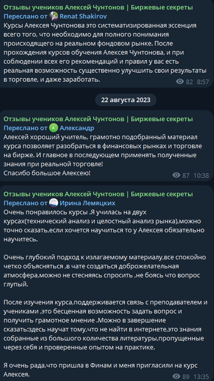 Реальных отзывов о трейдере Алексее Чунтонове нет. Независимые сайты не делали на него обзоров. В отдельном канале Telegram есть только такие сообщения от 2023 года. Там просто перечисление курсов и восторженные комментарии.
