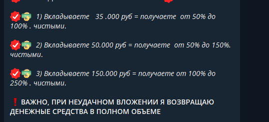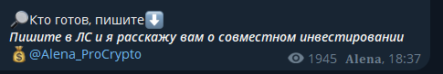Интересно, что условия работы с Алена Про Крипто не такие нереалистичные, как в других ресурсах по раскрутке счетов. Обычно депозит обещают увеличить чуть ли не в сотни раз, здесь же суммы гораздо ниже, однако вложения значительные – минимально 35 тыс. рублей. Отдавать такие деньги практически анонимному автору, который ведет канал с явной накруткой – вряд ли хорошая идея.Тем не менее пользователя пытаются убедить в том, что клиенты остаются довольными. Однако считать скриншоты веским доказательством нельзя. Ни одной ссылки тут нет, тем более полные диалоги админ никогда не показывает, что тоже доверия не вызывает.