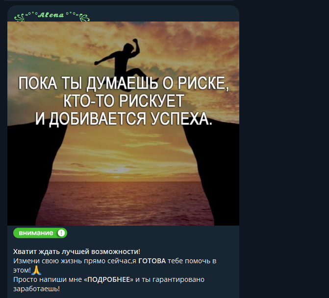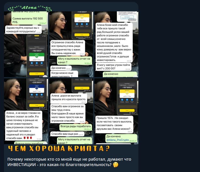 Алена Про Крипто – это телеграм-сообщество, которое якобы ведет криптовалютный эксперт. Девушка утверждает, что зарабатывает на беззаботную жизнь с помощью трейдинга и предлагает то же самое сделать остальным с помощью нее. Пользователям, на первый взгляд, предлагают очень легкий заработок, однако действительно ли все в проекте соответствует обещаниям или нет, мы разберемся в этом обзоре.