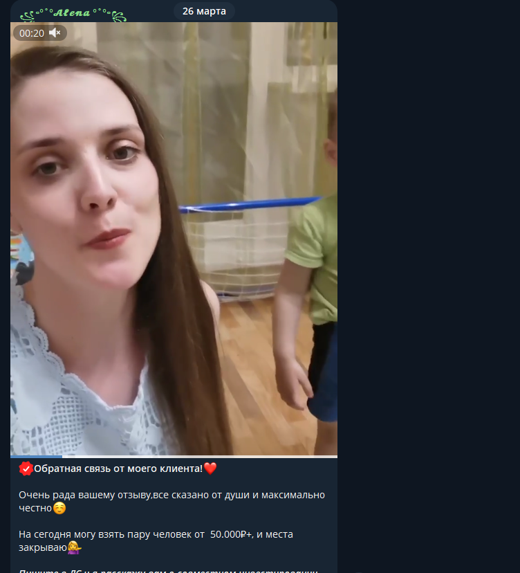 Отзывы в группе Alena Pro Crypto тоже по стандарту выполнены в формате видео: почти всегда они записаны женщинами с детьми и выглядят совсем неубедительно, имя Алены, конечно, ни в одном из роликов не упомянуто.