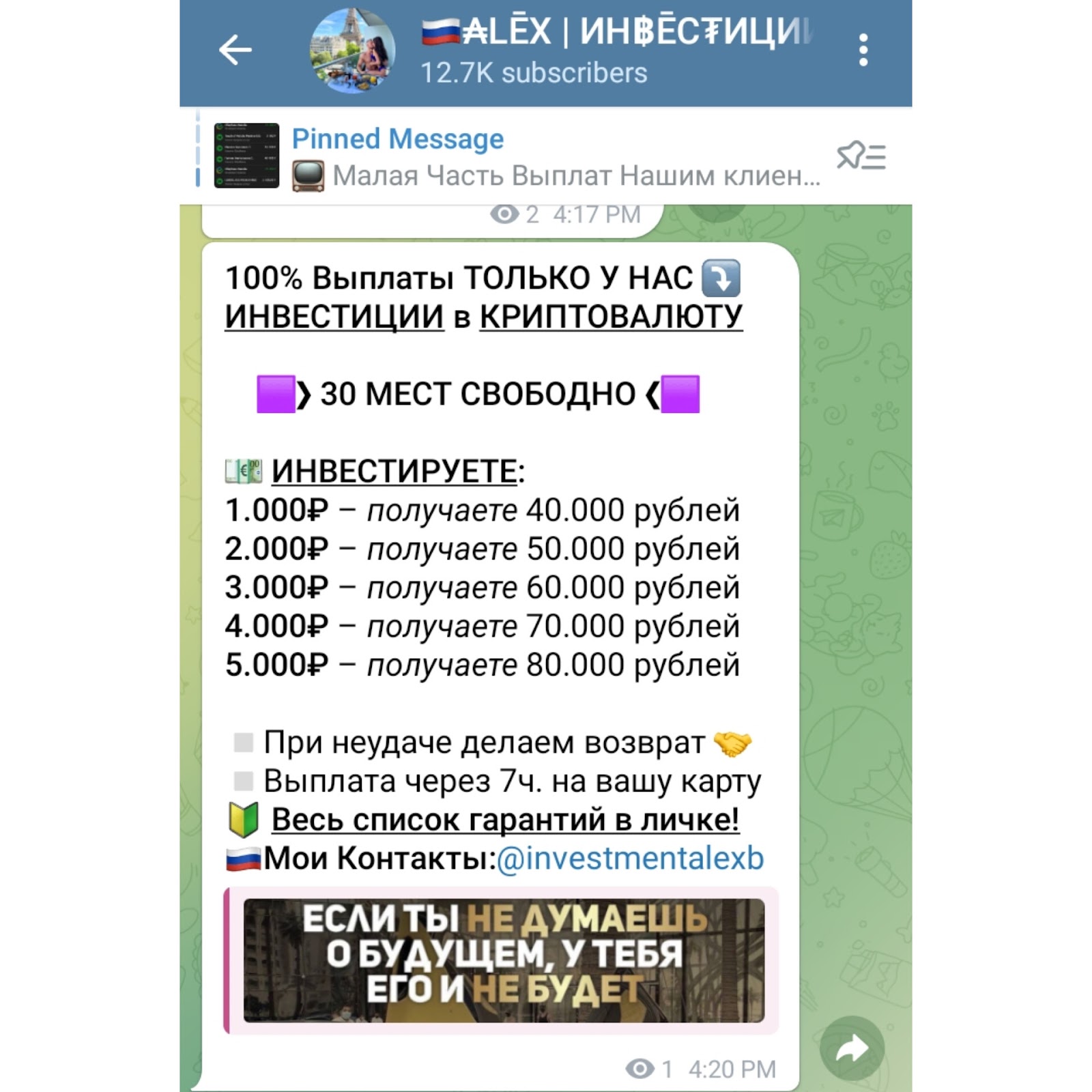 - инвестиция 4 000 р. Подписчику отправят 70 тыс. руб.;