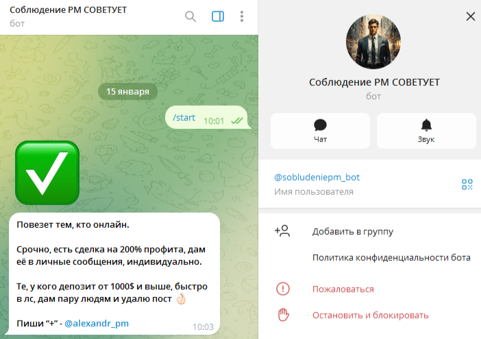 Помимо телеграм-канала, у блогера есть бот «Соблюдение РМ СОВЕТУЕТ» @ sobludeniepm bot. В чем его миссия – непонятно, так как тут нет никакого описания. После запуска сервиса приходит сообщение о том, что автор предлагает совершить сделку и обещает, что с нее можно получить 200% профита. Ее он выдаст только тем, то напишут ему в личку.