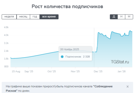 Наша проверка показывает похожий результат. Ни положительных, ни отрицательных отзывов от клиентов трейдера Alex РМ «Соблюдение рисков» не видно. Стоит заметить, что на блог подписано 4,5 тысячи подписчиков. Как показывает статистика канала, в декабре 2025 года тут был резкий рост аудитории.