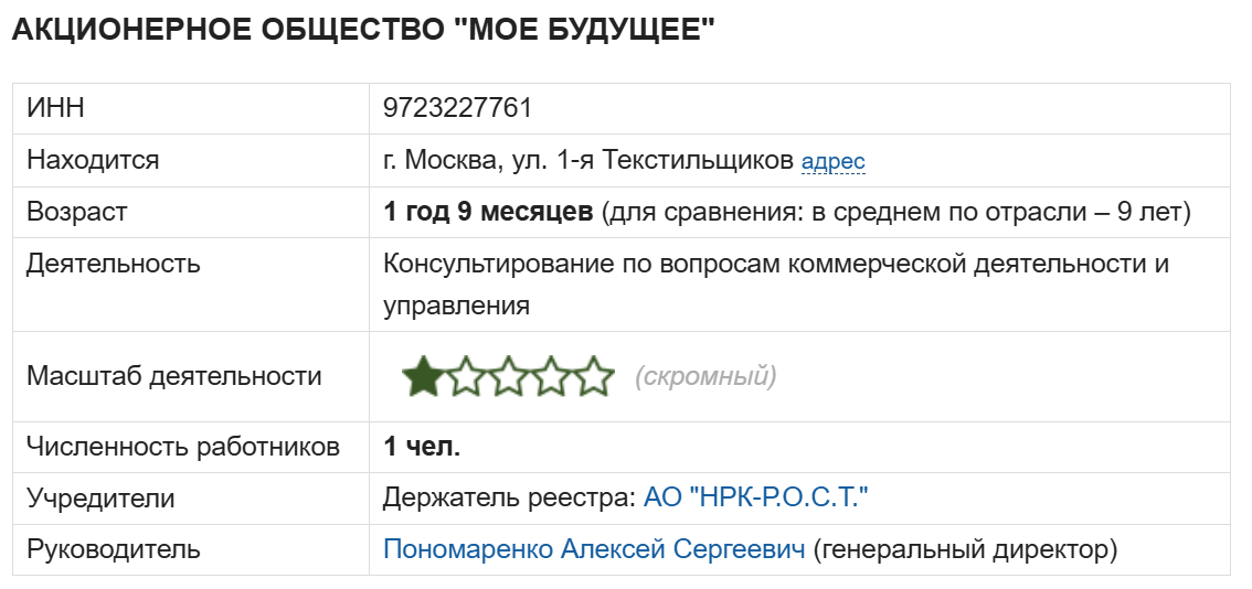 Компания АО Мое будущее объединяет все рассмотренные выше платформы. Она является сравнительно молодым проектом и зарегистрирована около двух лет назад в Москве. Основная деятельность направлена на консультирование в сфере коммерческой деятельности и управления. В роли учредителя выступает АО НРК-Р.О.С.Т. Руководителем и единственным сотрудником является сам Пономаренко Алексей Сергеевич.
