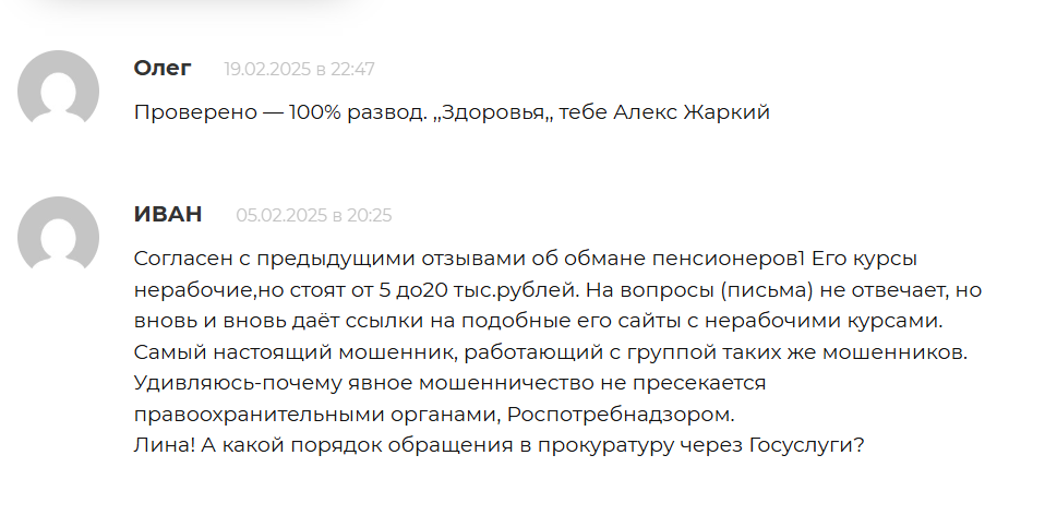 Что думаете вы об этой обучающей платформе? Доверяете ли вы Алексу Жаркому как наставнику? Проходили ли его обучение? Поделитесь своим реальным опытом в комментариях.