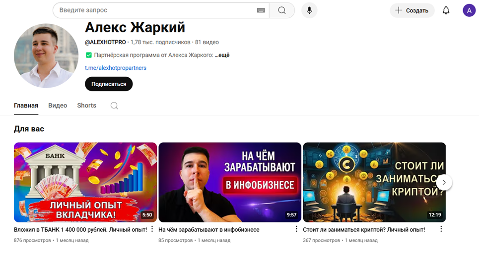 Другие медийные ресурсы у наставника развиты слабо. Есть страница на Youtube. Подписчиков там немного, менее 2000 человек. Инвестор публикует актуальные новости из сферы криптовалюты, трейдинга и инфобизнеса.