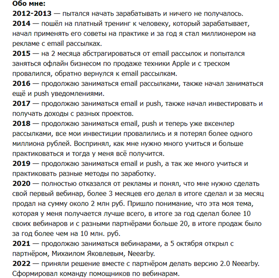 В ходе детального анализа деятельности платформы Neearby и ее основателя редакция пришла к однозначному выводу о том, что данная площадка не предоставляет пользователям реальных возможностей ни для получения качественных знаний, ни для стабильного заработка. Алекс Жаркий — обычный инфоцыган и мошенник, который вытягивает деньги с доверчивых новичков через стандартную воронку продаж.