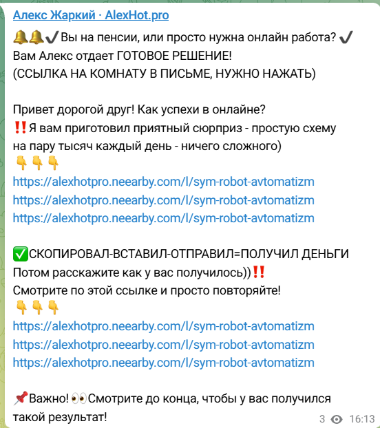 Сообщения бота написаны так, чтобы создать триггер для потенциального клиента. Он будто торопит перейти по ссылке и посмотреть видео, дублируя этот посыл 6 раз в одной публикации.