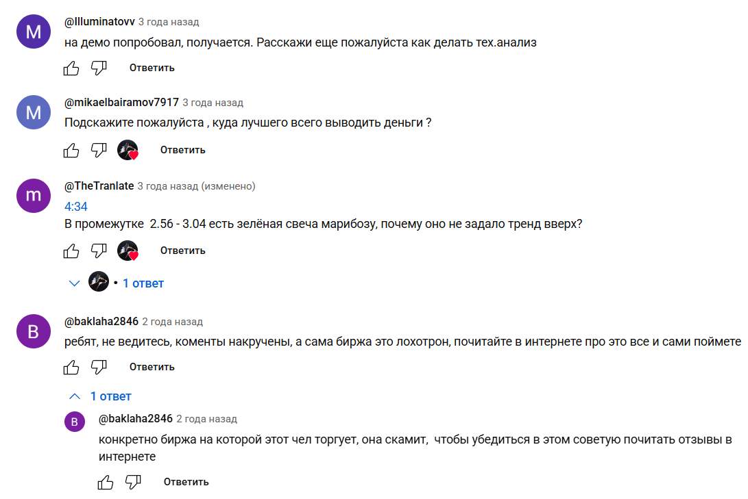 Комментарии на Ютуб в основном положительные, а довольные пользователи говорят, что бинарные опционы реальная тема, на которой можно неплохо заработать, ведь даже с демо-счетом у кого-то забрать прибыль получилось. Отрицательных мнений мало, но они перекрывают все другие, ведь в таких сообщениях пишут, что комментарии фейковые, а известная биржа, которую советует трейдер, развод.