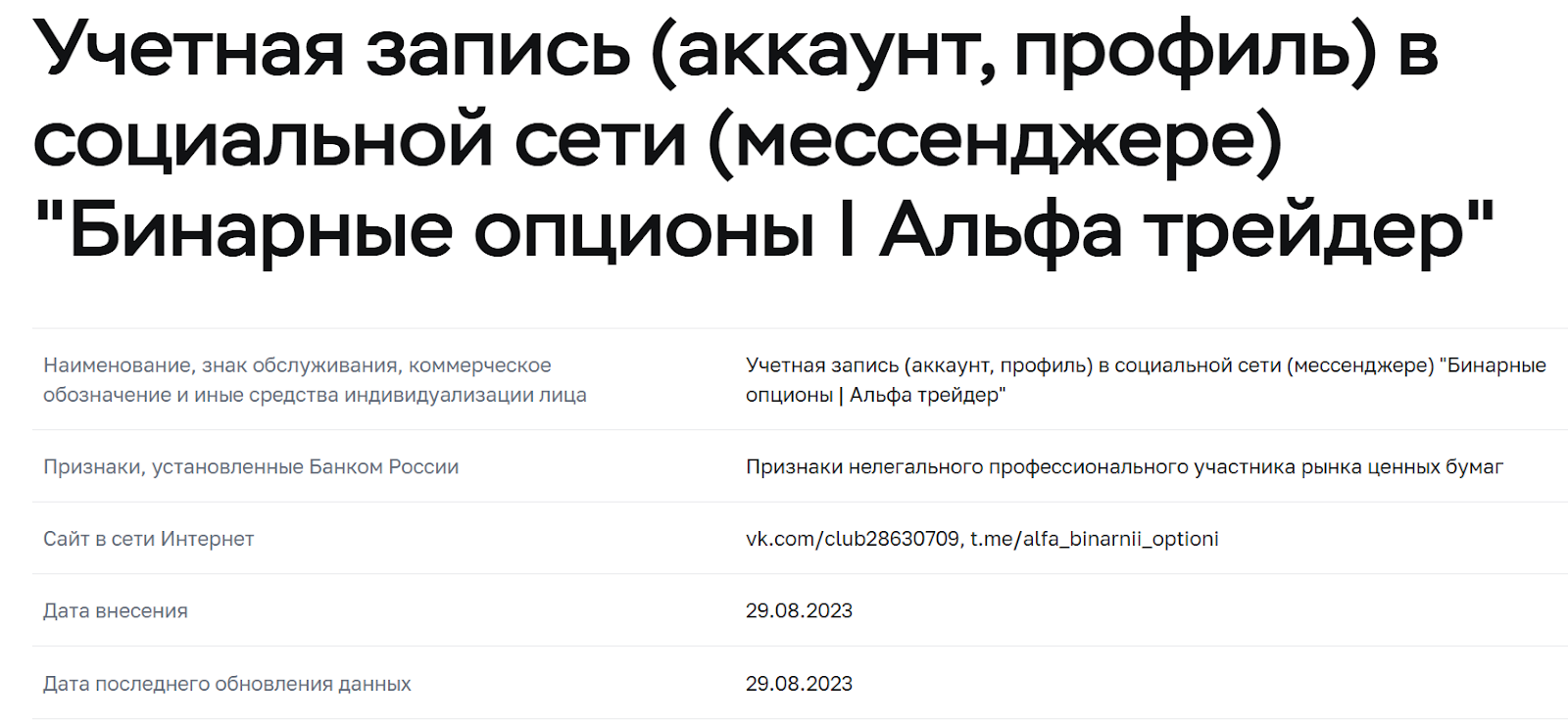 В публикациях на канале с ником Alfa_Binarnii_Optioni автор давал прогнозы по движению курса, но свои сделки не демонстрировал, не рассказывал о том, какие методы использует для анализа, а в сентябре 2025 года проект вообще недоступен. Более того, ЦБ РФ внес канал в Тг «Альфа Логово» в список нелегальных участников рынка ценных бумаг, причем это произошло еще в 2023 году.