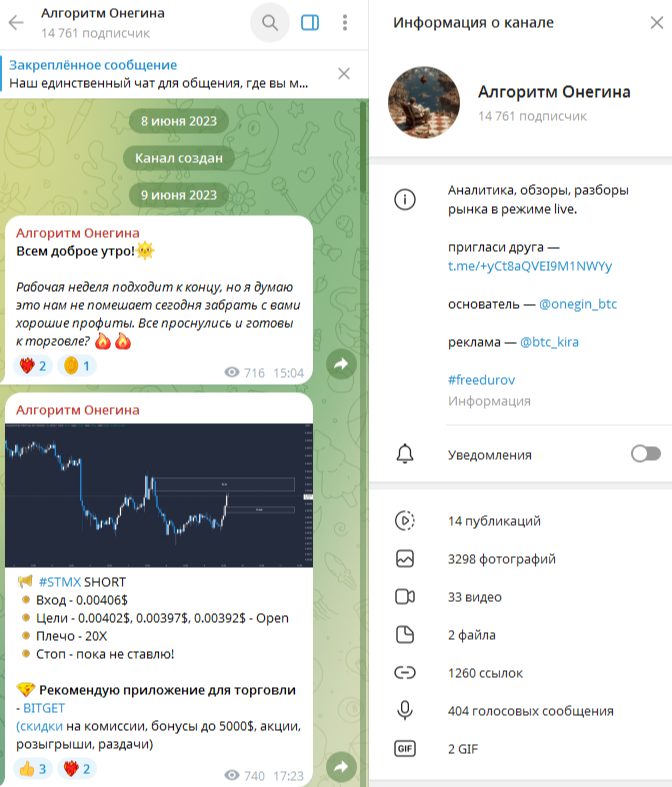 Телеграм-канал @ onegin btc был зарегистрирован 8 июня 2023 года. С самого начала владелец начал выкладывать бесплатные публикации, связанные с криптой и финансами. Странно, что админ решил не представляться перед аудиторией и что-то рассказывать о своем сообществе.