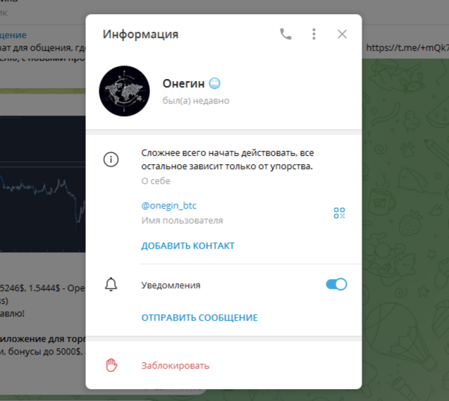 В описании группы мы прочитали, что в блоге будет выходить аналитика и обзоры инвестиционного рынка. Здесь же мы обнаружили адрес @ btc_kira, по которому можно обращаться по вопросам рекламы, а также адрес @ onegin btc самого админа. Только странно, что он не стал демонстрировать о себе какую-то информацию.