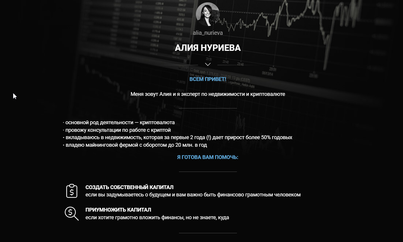 Aliarits – это псевдоним майнера Алии Нуриевой. Девушка называет себя экспертом по недвижимости и криптовалюте. Трейдер предлагает пользователям платные консультации по торговле на современном финансовом рынке. Девушка утверждает, что вкладывается в недвижимость, которая за первые два года дает 50% прибыли. Верифицированной отчетности при этом Алия Нуриева на Crypto Realty Mining не публикует. Утверждение, что она владеет майниговой фермой с оборотом до 20 млн в год – не более чем красивая легенда для привлечения внимания доверчивых трейдеров. Мы решили разобраться, как девушка помогает создавать и приумножать капиталы своих клиентов.